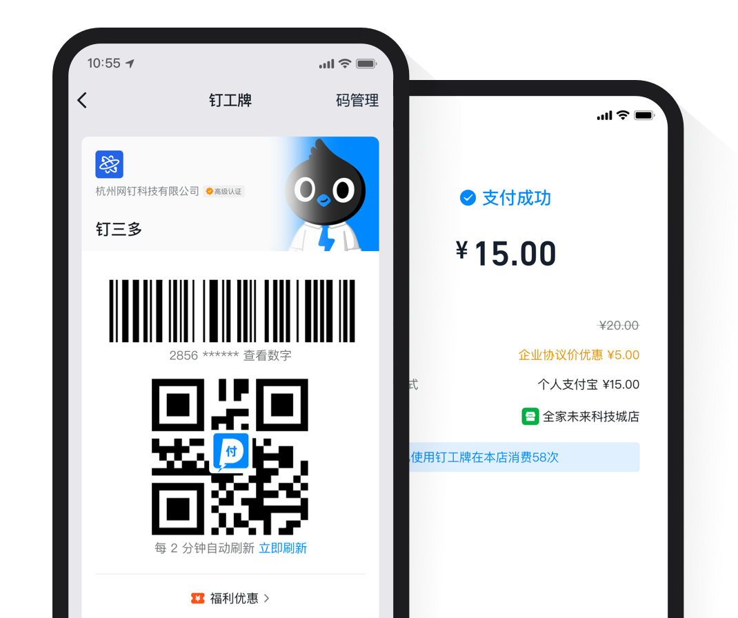 組織成員可在有企業協議價的商戶,通過釘工牌支付,享受折扣價。